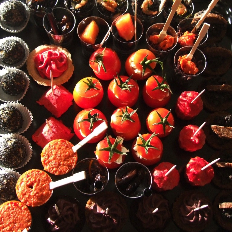 Produkty do przygotowania wyglądały dość dziwnie... Czerń sadzy, węgla, atramentu, dojrzałych oliwek, ciemnego sosu sojowego, kremu balsamicznego. Czerwień marchewkowa, buraczana, pomidorowa i ostra - paprykowa... Wszystko to by przygotować wyjątkowe, ekstremalne fusion, przekąski. Czerwono-czarne dlatego że takie kolory ma logo Klienta, dla którego były przygotowywane. "Preparowanie" było fantastyczną, improwizowaną zabawą w smaki, zapachy, kolory i kształty :) Przekąski podaliśmy na czarnych kwadratowych tacach, zakomponowane w kształt logo. Wrażenia Gości - eksplozje najróżniejszych doznań, często nieokreślonych, choć zdecydowanie pozytywnych...